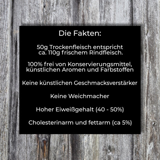 "Meidän Beef Jerky ei ehkä ole dieettiruokaa, mutta se on korkean proteiinipitoisuuden elintarvike, joka vie kielen mennessään erinomaisella maullaan. Proteiinipitoisuus on todella vaikuttava: 100 grammassa Beef Jerkyä on noin 50 grammaa proteiinia . Voit napostella tätä herkullista kuivattua lihaa käytännössä aina ja kaikkialla, kotona ja työpaikalla, matkalla autossa ja vapaa-ajan aktiviteeteissa. Valmistettu parhaasta naudanlihasta ilman turhia lisäaineita, se omaa Biltongin intensiivisen ja herkullisen luonteen."